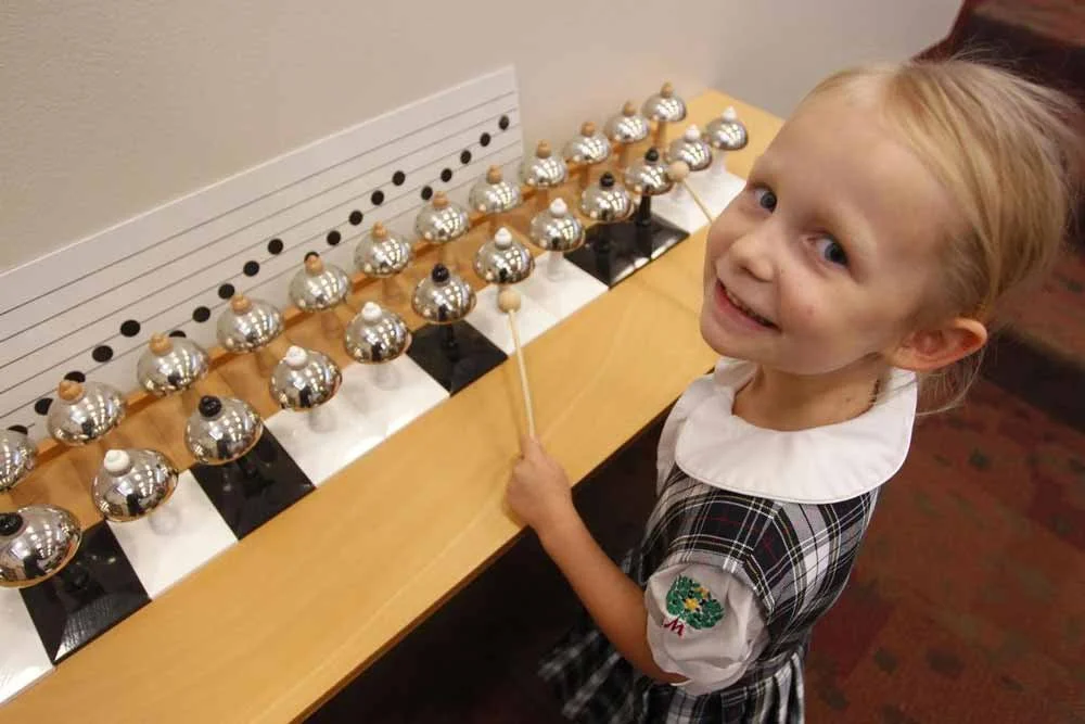 Music instruction in our specially designed music room is an integral part of our day-to-day curriculum. Our students gain musical literacy through ongoing opportunities to listen, sing, compose, perform, and appreciate music. Young stars build self-confidence by being on stage at school performances throughout the year. We use specially designed Montessori bells and tone bars to help children develop skills in a series of steps, from auditory discrimination to musical notation and composition. This helps enhance the development of rhythm, coordination, tonal relationships, and harmony.